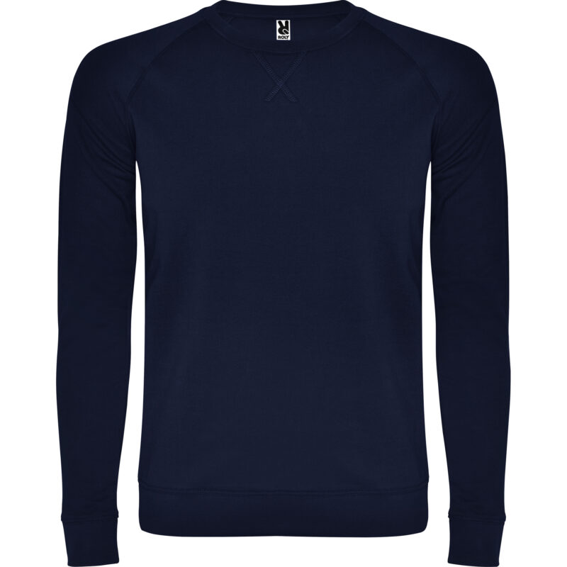 Sudadera unisex cuello redondo de algodón no perchado. Manga ranglan. Cuello, puños y cinturilla en canalé 2×1 con elastano. Adorno de costuras cruzadas remalladas. Cubrecosturas del mismo tejido.