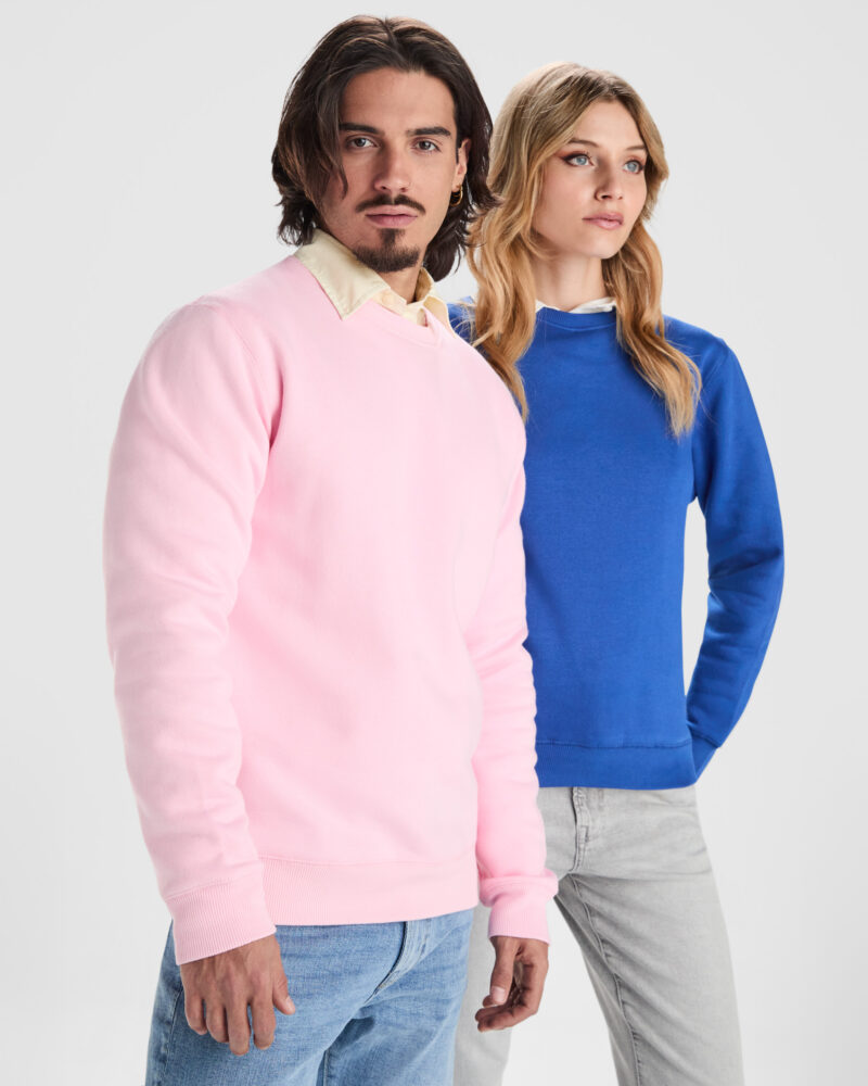 Sudadera unisex cuello redondo. Algodón orgánico peinado. Cuello, puños y cinturilla en canalé 2×1 con elastano. Todas las costuras remalladas. Media luna interior y cubrecosturas del mismo tejido. Certificado OCS y GRS.